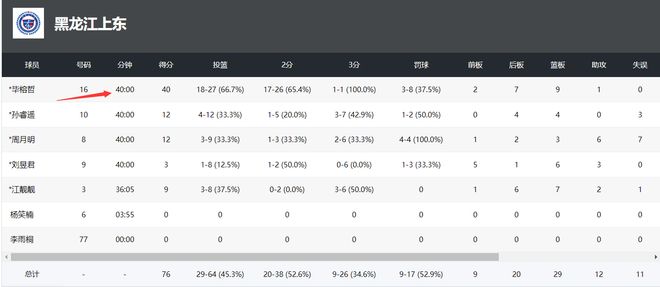 毕榕哲、孙睿遥、周月明、刘昱君四人都打满全场,全队拿到76分而先发小前锋毕榕哲一人就拿到40分,此役她27中16,三分1中1,罚球8中3,拿到40分9篮板1助攻1抢断,命中率66.7%,三分命中率100%,得分占比全队52.6%,说她一人扛起黑龙江都不为过。