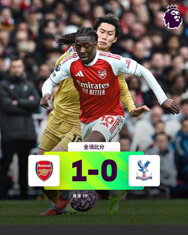 上半场,阿森纳控球率66%占优情况下,3次射门2次打正,没有获得角球机会。直到第39分钟,阿森纳终于打破了僵局,赖斯主罚任意球送入禁区,埃泽抢到第二落点直接爆射破门,比分1-0领先。下半场,阿森纳继续掌控比赛局面,但未能扩大领先优势,最终还是1-0击败水晶宫,取得各项赛事7连胜。